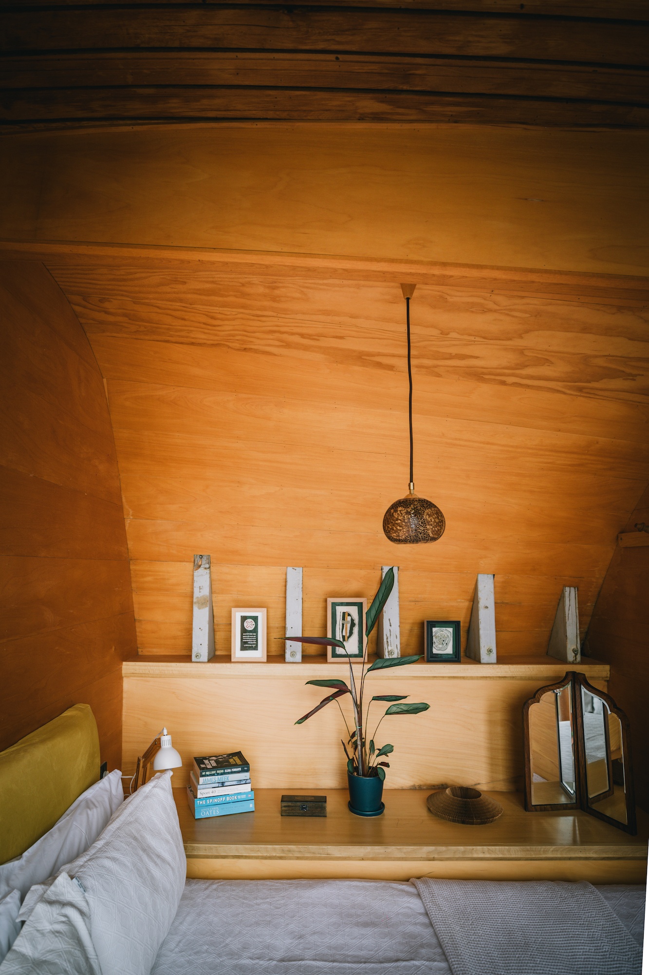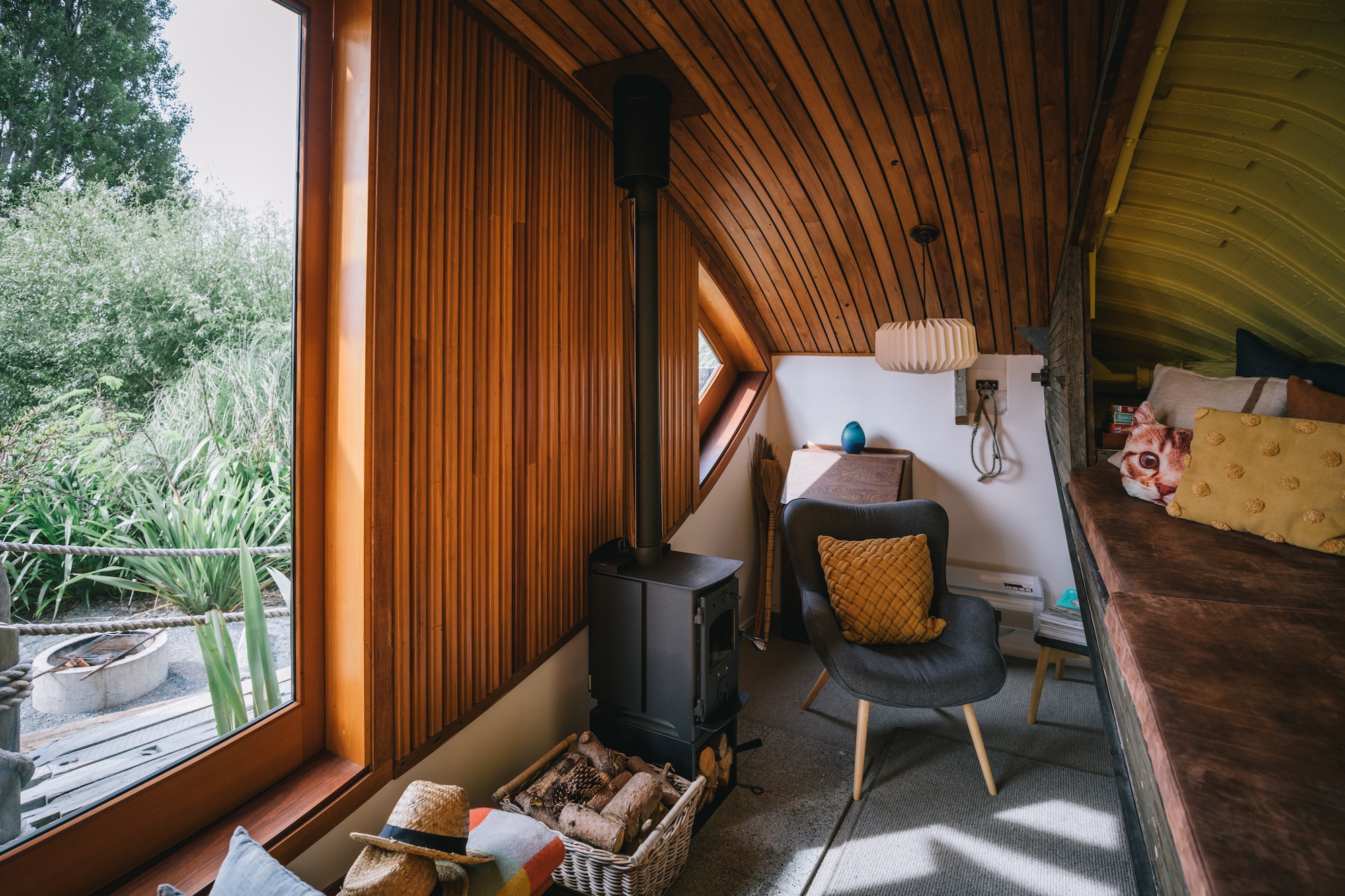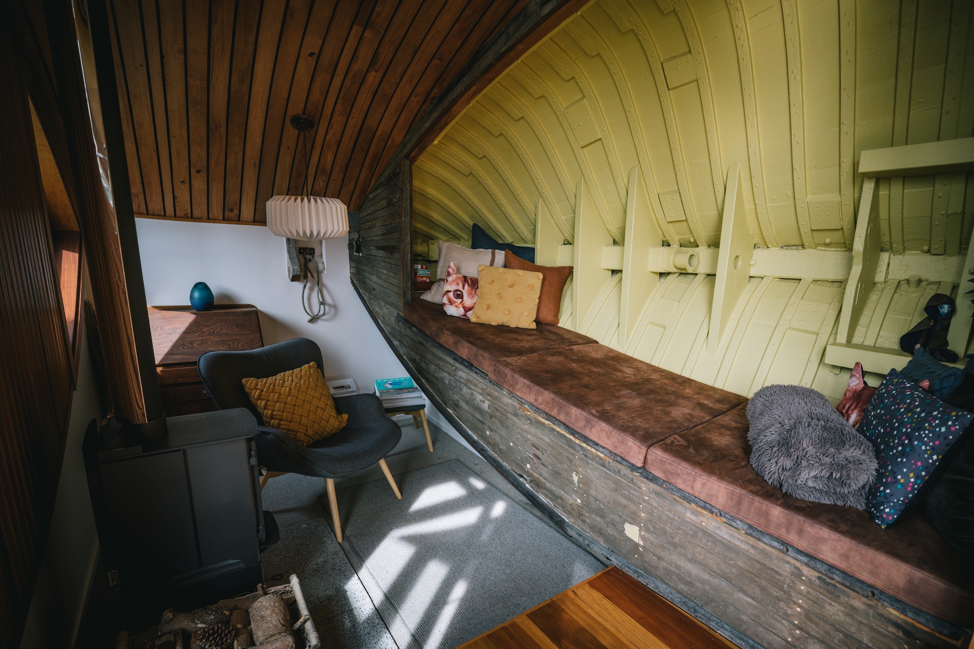 There’s a curved sofa built into the hull of the ship where you can curl up with a book and just be at peace. With a little logburner, it’s the epitome of cottage-core. Though I was here in the middle of the summer, so it was definitely not needed.