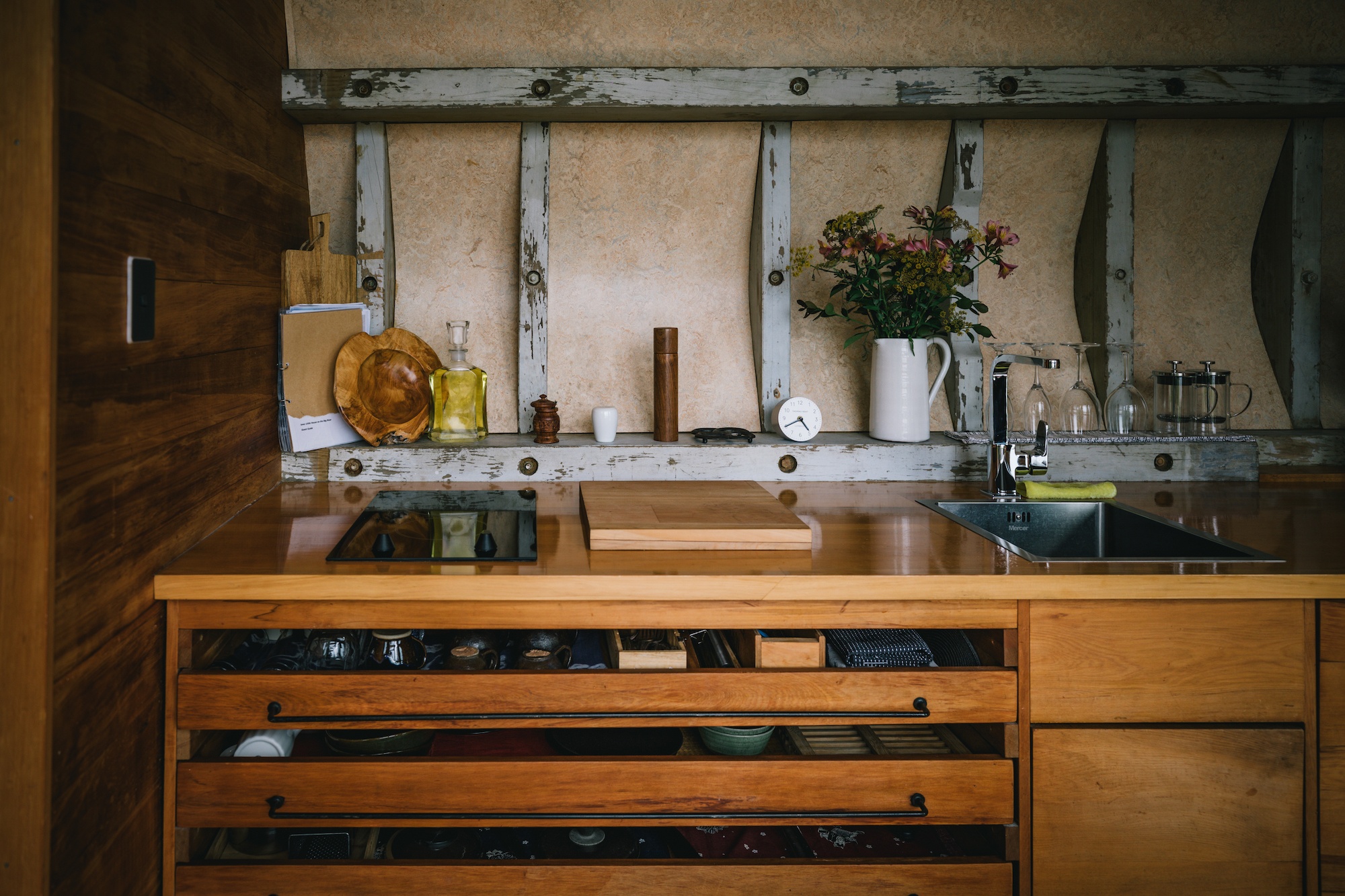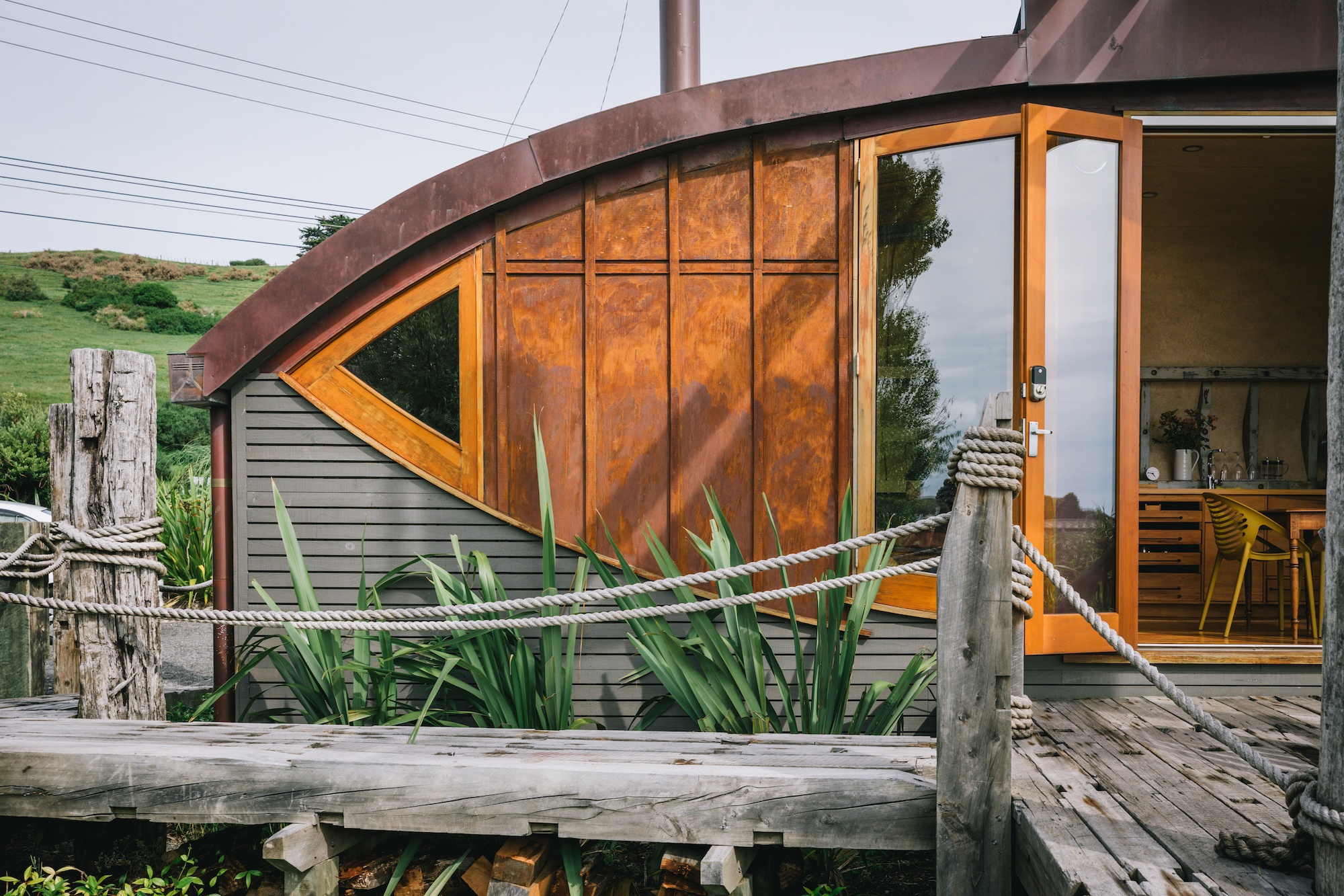 This cute tiny house is built into the hull of the Iona, an old kauri and totara riverboat used for fishing a century ago in Dunedin. Local architect Elinor McDouall saw the old boat for sale on Trademe in Northland in 2016 and decided to give it a new lease on life.