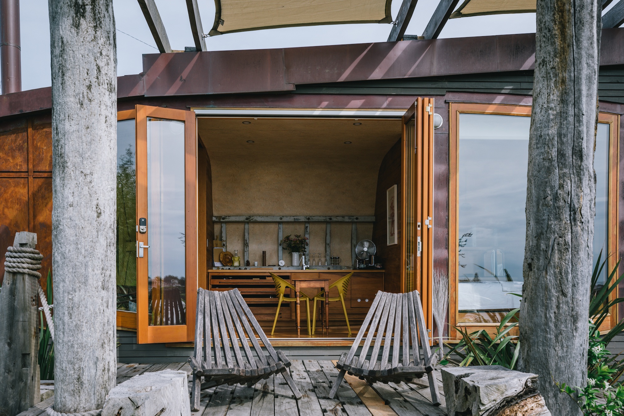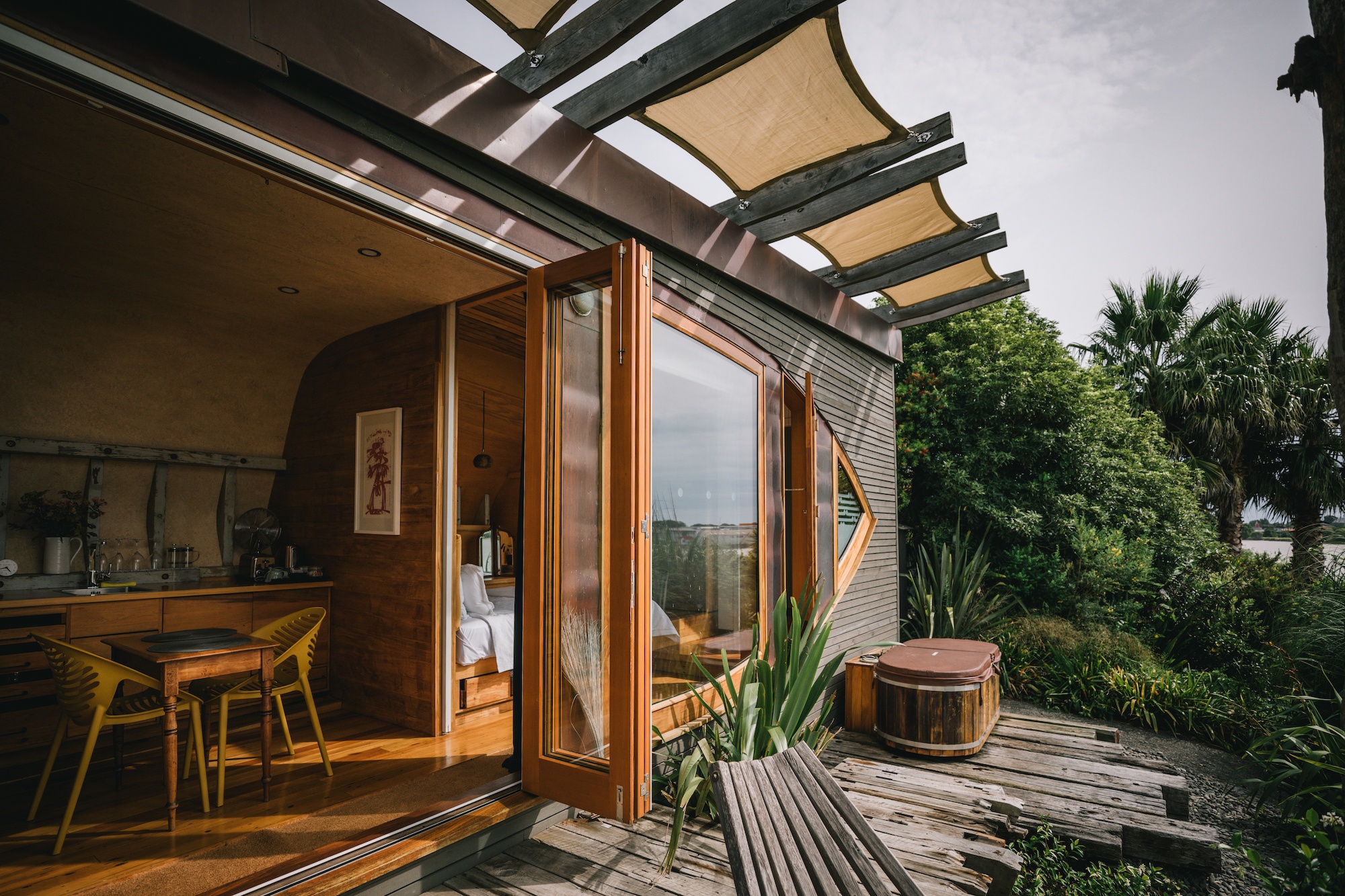 As you get out of the car, you see the hull of the Iona forms the back of the house, still distinctly boat-shaped. Then you meander around a wooden plank path to arrive at the front, which overlooks the river. With a wooden spa outside, it couldn’t be more idyllic. It’s also fully enclosed and set up like a home, so it’s less glamping and more tiny house-ing. It can be opened up or closed off.