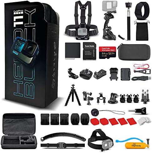 Bundle Includes: 1 x GoPro HERO11 Black - Waterproof Action Camera with Front LCD and Touch Rear Screens, 5.3K HD Video, 27MP Photos, Live Streaming, Stabilization | 1 x 50 in 1 Go Pro Accessory Kit | 1 x Extreme Pro 64gb microSDXC Card | 1 x 6AVE Electronics TM Microfiber Cloth