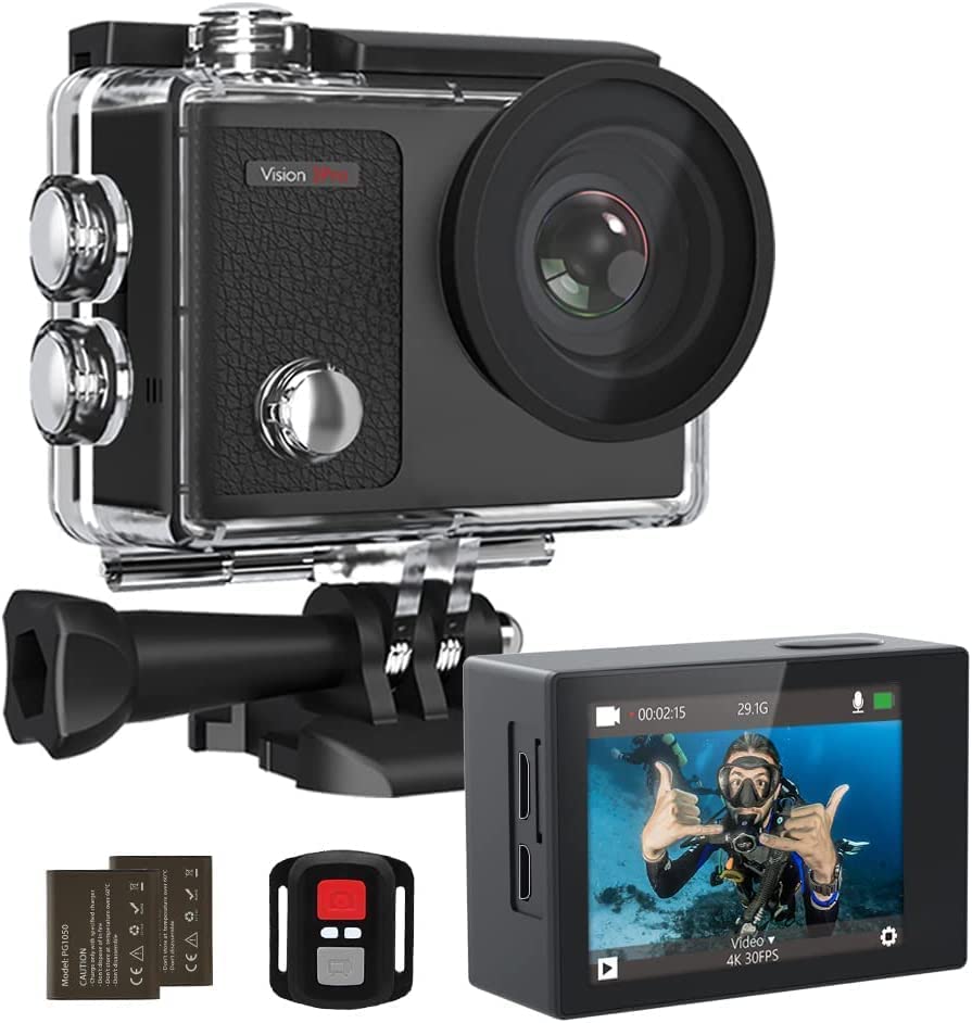 Dragon Touch 4K Underwater HD Action Camera, Vision 3 Pro Touch Screen 20MP 100FT Waterproof Video Camera Adjustable View Angle WiFi Sports Camcorder with Remote Control Helmet Accessories
