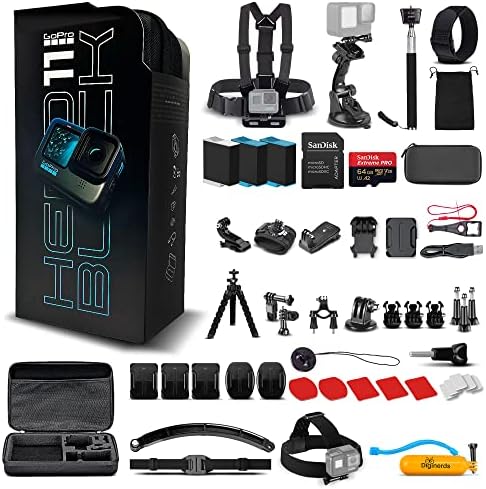 Bundle Includes: 1 x GoPro HERO11 Black - Waterproof Action Camera with Front LCD and Touch Rear Screens, 5.3K HD Video, 27MP Photos, Live Streaming, Stabilization | 1 x 50 in 1 Go Pro Accessory Kit | 2 x Compatible Rechargeable Li-Ion Battery |1 x Extreme Pro 64gb microSDXC Card | 1 x 6AVE Electronics TM Microfiber Cloth