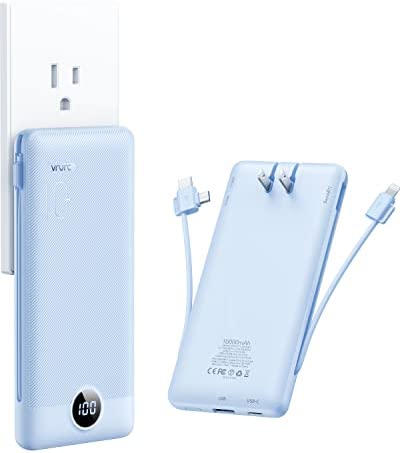 VRURC Portable Charger with Wall Plug, 10000mAh Power Bank, Mobile Power Built-in Cables, 5 Output Dual Input Smart LED Display, Rechargeable Battery Compatible with iPhone, Android, Tablet etc-Blue