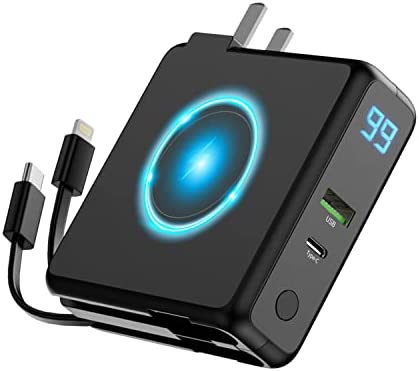 All-in-one power supply: With a wall plug and USB output port, this portable charging power supply comes with USB C and Lightning cables. It offers 20W PD fast charging, 15W wireless charging, 4 outputs, and 2 inputs to charge up to 4 devices simultaneously. Enjoy worry-free travel with this versatile power bank.