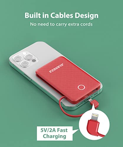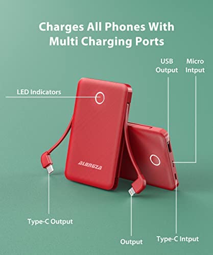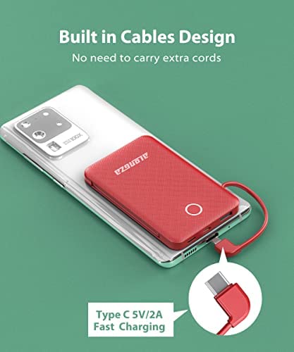 Alongza Portable Phone Charger Built in Cable 6000mAh Power Bank Small Battery Pack Lightweight USB Type C Slim External Backup Charger for Cell Phones